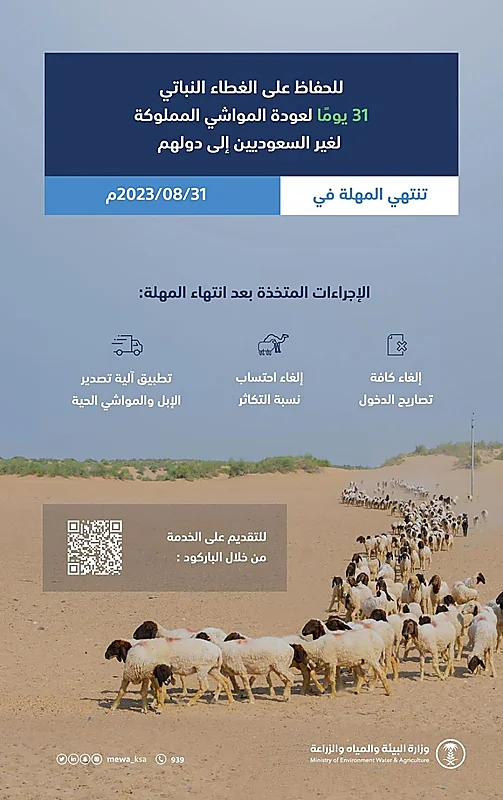 دعت وزارة البيئة والمياه والزراعة ملاك ورعاة الإبل والمواشي الغير سعوديين، للاستفادة من الشهر الأخير المتبقي على انتهاء المهلة الممنوحة لهم لعودة مواشيهم إلى دولهم، والتي تنتهي في 31 أغسطس 2023،تفاديًا لتطبيق الإجراءات المعلنة.