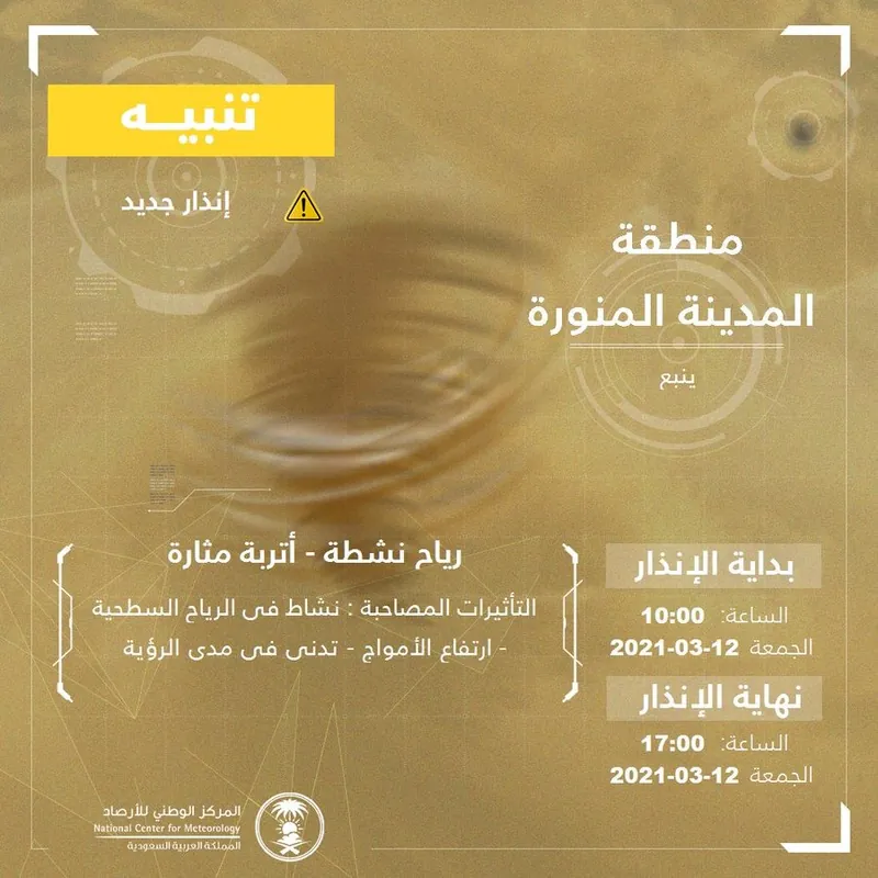 وأكد المركز الوطني للأرصاد الجوية أن منطقة المدينة المنورة ستشهد نفس الحالة الجوية في ينبع وذلك من الساعة 10 صباحاً حتى الساعة الخامسة مساء.