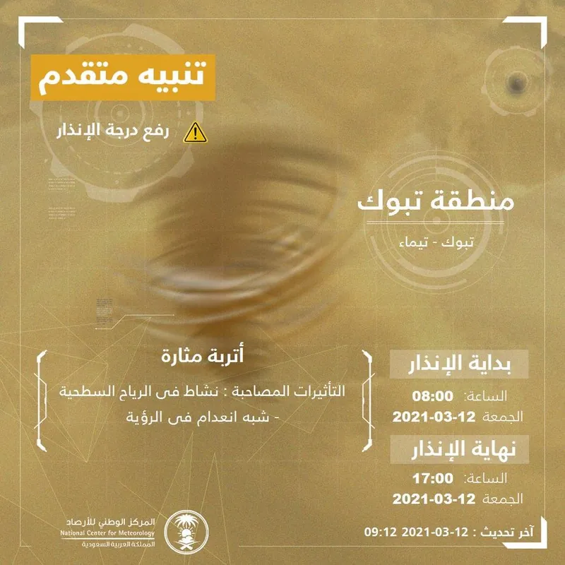 حذر المركز الوطني للأرصاد الجوية اليوم الجمعة منطقة تبوك من أتربة مثارة ونشاط في الرياح السطحية مما يؤدي إلى شبه انعدام في الرؤية .