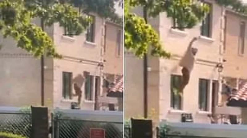 وأظهر مقطع فيديو، السيدة بساقيها المتدليتين من النافذة، وهي تحاول الإمساك بالحافة، قبل أن تنزلق وتسقط إلى الأسفل. وهو ما تلاه سماع لدوي إطلاق النار، حينما تبادل الزوج مع النجدة طلقات الرصاص، فيما تعرضت لكسر في الساق وتتلقى العلاج في مستشفى محلي.