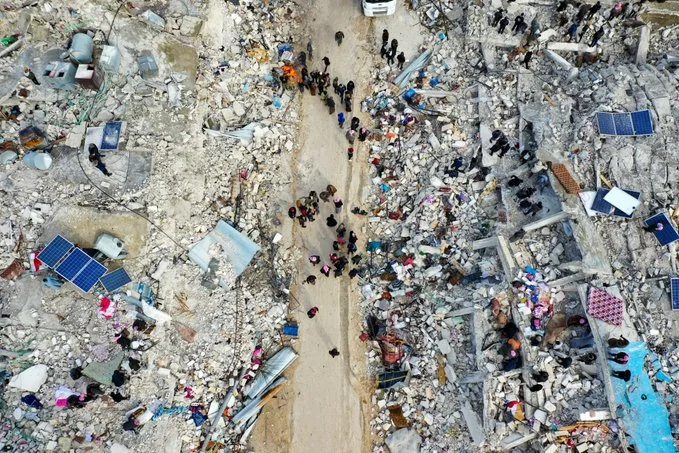 أظهرت لقطات جوية آثار الدمار، الذي خلفه الزلزال المدمر الذي ضرب مدينة إدلب شمال غربي سوريا اليوم الأثنين.