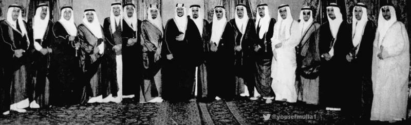 أظهرت صورة نادرة، الملك سعود بن عبدالعزيز، رحمه الله، مع أخوانه الأمراء بعد توليه الحكم ومبايعتهم له في قصر خزام في جدة عام 1372هـ /1953م.