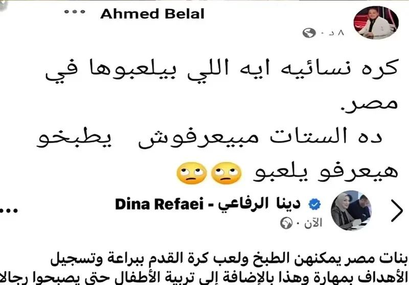 وكتب أحمد بلال : "كرة نسائية إيه اللي بيلعبوها في مصر..وأضاف: "ده الستات مبيعرفوش يطبخوا، هيعرفوا يلعبوا"، وبعد دقائق من نشر "البوست" قام أحمد بلال بحذف المنشور مرة أخرى.