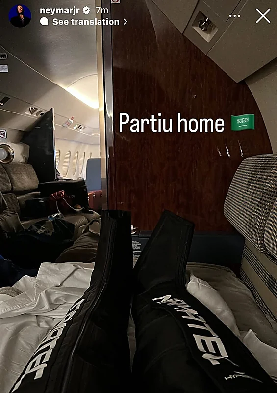 وظهر النجم البرازيلي خلال تواجده بالطائرة المتجهة للرياض برداء اعتاد الظهور به ويبدو أنه يلجأ إليه لعمليات الاستشفاء، حيث أرفق الصورة بتعليق " partiu home??".